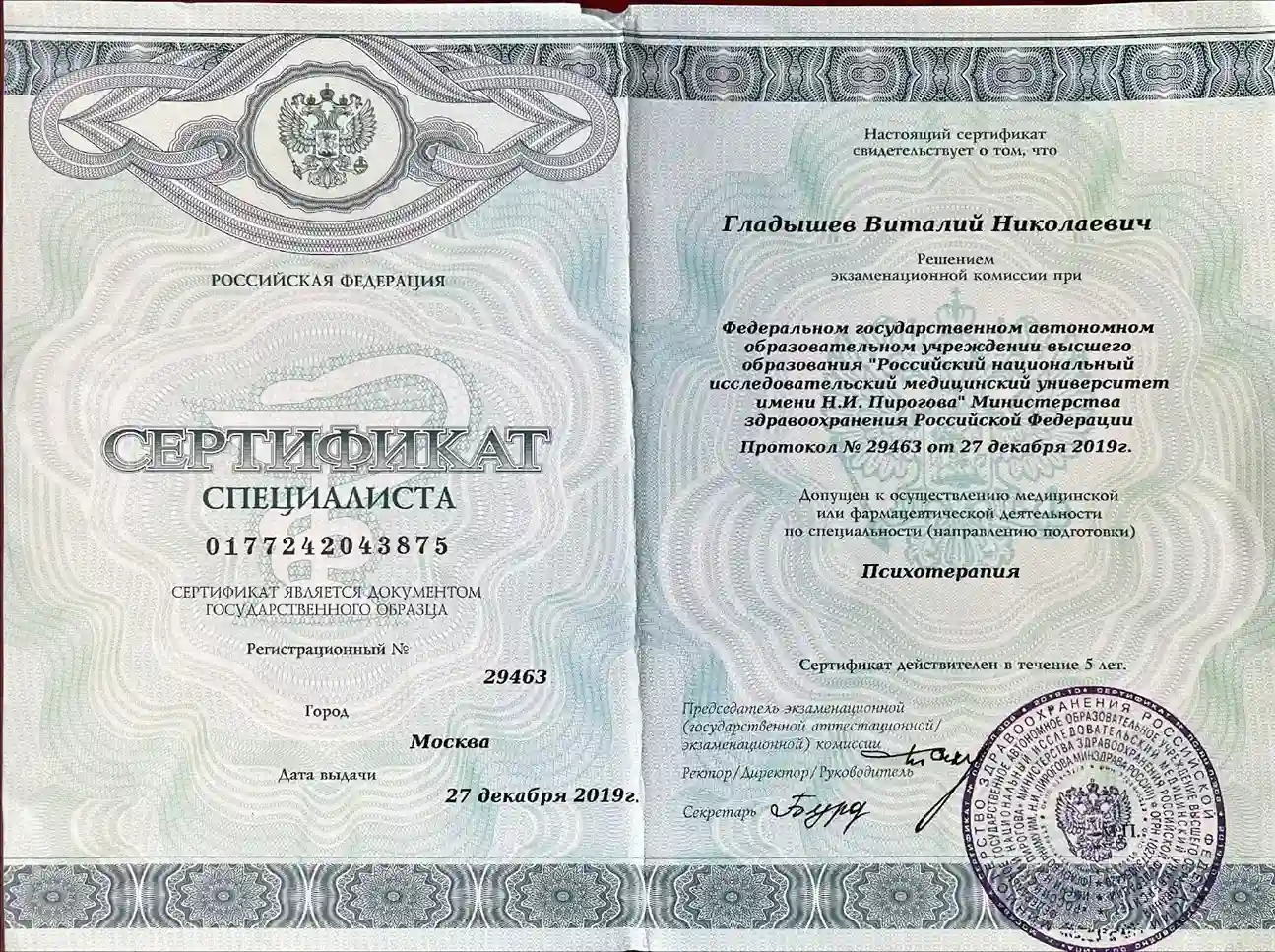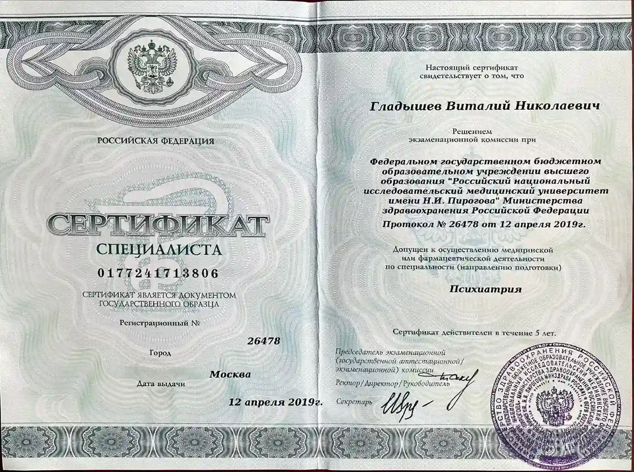 - Стаж работы по специальности с 1989 г. В Московском здравоохранении с 1999 г., работал врачом-психиатром, заведующим психиатрическим отделением, заместителем главного врача в одной из Московских психиатрических больниц. Действующие сертификаты по специальностям «психиатрия», «психотерапия».